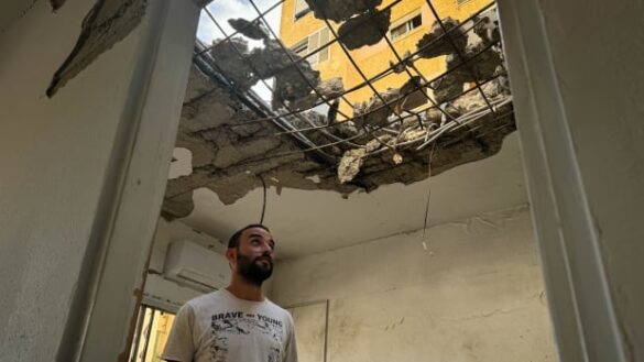 Le superviseur du bâtiment du nord de Haïfa travaillait mardi dans un appartement au deuxième étage lorsque les sirènes du raid aérien se sont déclenchées. Il dit qu’il a à peine eu le temps de se rendre dans une pièce sûre avant qu’un projectile du Hezbollah ne traverse le toit, touchant l’endroit même où il se trouvait quelques instants auparavant.