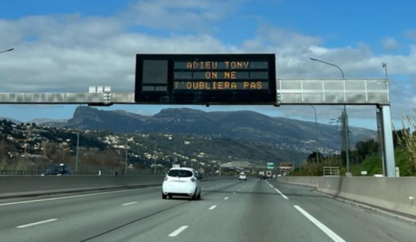 Les panneaux sur l'A8 entre Nice et Cannes, qui affichent habituellement des informations sur la météo, la circulation ou les accidents, affichaient à la place un message disant “Adieu Tony, on t'oubliera pas”.