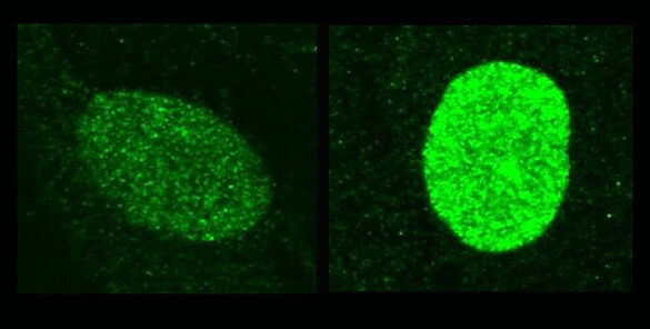 Ces images au microscope montrent comment l'interféron dans le noyau augmente les niveaux de la protéine protectrice IFI16 (colorée en vert) depuis de faibles niveaux de fond (à gauche) jusqu'aux niveaux plus élevés nécessaires pour résister à l'infection herpétique (à droite). Crédit : Centre d'imagerie HMS MicroN / Nicolas Romero Rata
