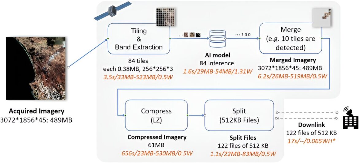 Simulation du processus de détection de fumée embarqué à l'aide de l'IA, détaillant les étapes de mosaïque, d'extraction de bande, d'inférence de modèle d'IA, de fusion d'images, de compression et de segmentation de fichiers pour la liaison descendante, ainsi que leurs besoins respectifs en matière de temps, de mémoire et d'alimentation. Crédit: Journal IEEE sur des sujets sélectionnés en observation appliquée de la Terre et en télédétection (2024). DOI : 10.1109/JSTARS.2024.3394574