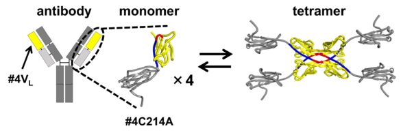 Les structures schématiques résultant de l'échange de domaines 3D de la région variable #4VL (jaune) dans la chaîne légère #4C214A (jaune et gris clair) d'un anticorps. La chaîne légère de l’anticorps s’est avérée maintenir un équilibre entre les états monomères et tétramères. Crédit : Shun Hirota et Takahiro Sakai