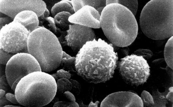 Cellules immunitaires myéloïdes aux côtés de globules rouges sur une micrographie électronique du sang humain. Crédit : National Cancer Institute