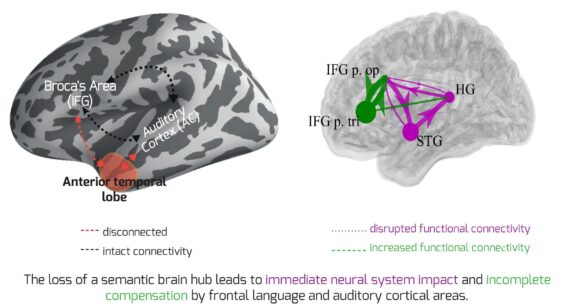 En obtenant des preuves de ce qui se passe lorsqu'un hub nécessaire au sens du langage est perdu, les chercheurs ont montré à la fois l'importance intrinsèque du hub ainsi que la capacité remarquable et rapide du cerveau à s'adapter et à tenter au moins partiellement de compenser immédiatement sa perte. . Les résultats ont été rapportés récemment dans la revue Communications naturelles.