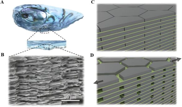 Architecture de composite naturel et synthétique de type nacre. A) Vue en coupe de nacre naturelle. B) Micrographie SEM montrant l'agencement 3D de comprimés d'aragonite liés entre eux par une matrice organique plus molle. C, D) Schéma d’un arrangement architecturé non déformé et déformé de nacre naturelle qui permet une déformation importante par glissement du comprimé et déformation viscoélastique de la matrice organique. Crédit: Matériaux fonctionnels avancés (2024). DOI : 10.1002/adfm.202313516