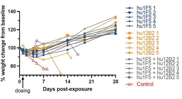 « Nous avons émis l’hypothèse qu’un anticorps monoclonal (mAb) contre la conformation de préfusion de la glycoprotéine F pourrait conférer une meilleure protection que m102.4 », a noté Zeitlin dans le rapport. « Pour tester cela, deux puissants mAb neutralisants contre la protéine F du virus Nipah, hu1F5 et hu12B2, ont été comparés dans un modèle de hamster. Hu1F5 a fourni une protection supérieure à hu12B2 et a été sélectionné pour la comparaison avec m102. »
