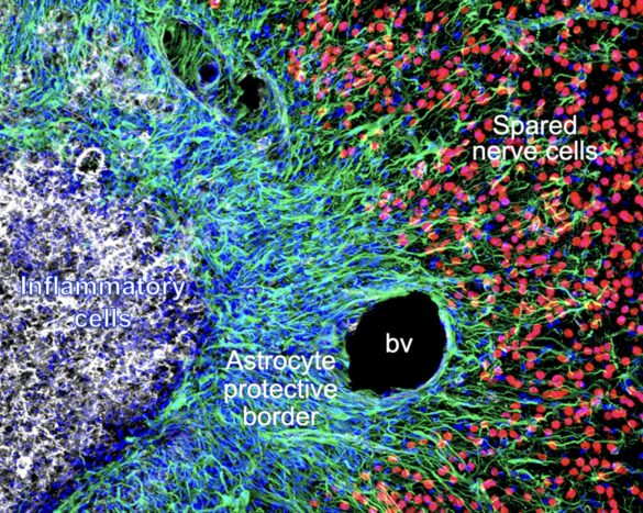 « Ces bordures d’astrocytes nouvellement générées servent à protéger les neurones épargnés immédiatement voisins en entourant les cellules inflammatoires qui s’infiltrent dans la zone endommagée, pour nettoyer les débris et protéger contre l’infection. »
