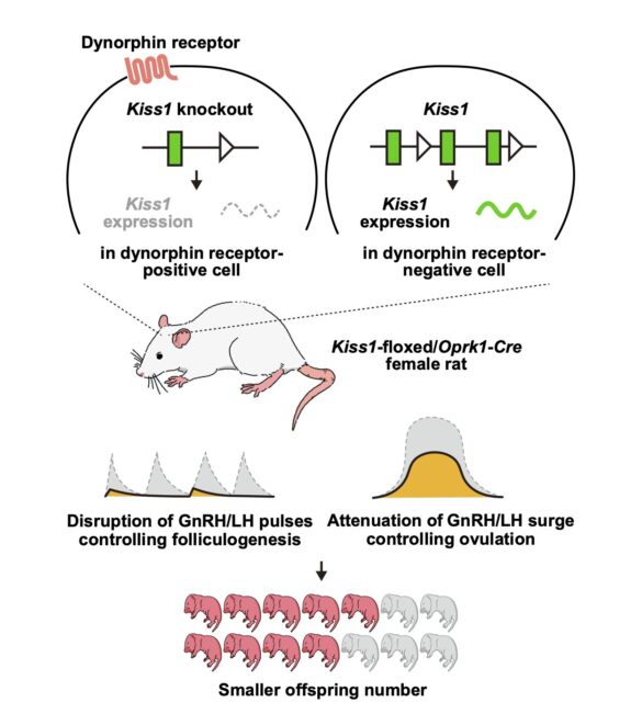 Pour étudier cela, les chercheurs ont génétiquement modifié des rats femelles pour supprimer Kiss1, un gène qui code pour la kisspeptine, uniquement dans les neurones exprimant le récepteur de la dynorphine. Ils ont découvert que les rats génétiquement modifiés dont Kiss1 était supprimé dans les cellules exprimant le récepteur de la dynorphine n'avaient que 3 % de neurones à kisspeptine dans l'ARC et 50 % dans l'AVPV. Les rats étaient encore fertiles mais avaient un cycle œstral plus long, un poids ovarien inférieur et moins de petits que les rats normaux.