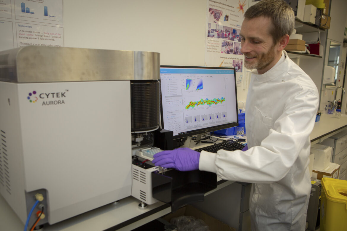 Le Dr Oliver Burton, auteur principal de l'étude, utilise la cytométrie spectrale pour analyser les cellules T régulatrices anti-inflammatoires de différents tissus. Crédit : Louisa Wood, Institut Babraham