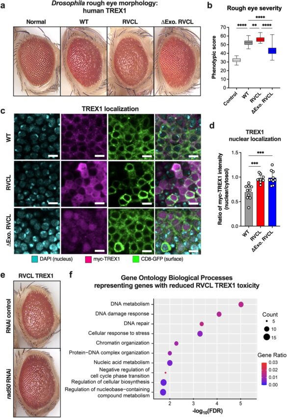 TREX1 tronqué en C-terminal, pathogène, exacerbe le phénotype de l'œil rugueux chez la drosophile. Crédit: Communications naturelles (2024). DOI : 10.1038/s41467-024-49066-7