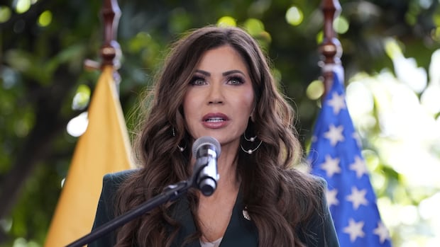 Noem a pris la parole lors d’une visite dans une partie du mur du Nouveau-Mexique, où elle a également ramassé un rouleau de peinture pour aider avec la peinture.