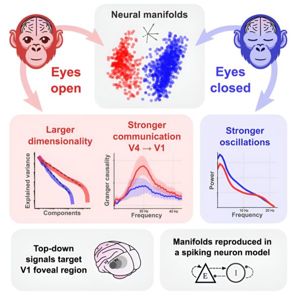 L’activité coordonnée de nombreux neurones dans le cerveau peut être décrite comme une variété. En utilisant des données électrophysiologiques, les chercheurs ont découvert que l’activité du cortex visuel bascule entre deux modèles de variété neuronale dès que les yeux sont ouverts ou fermés.