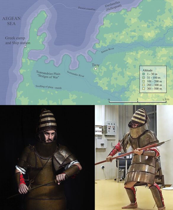 En haut : Géomorphologie de la zone entourant Troie dans les phases ultérieures de l'âge du bronze tardif (les étiquettes indiquent l'emplacement des deux campements militaires et les caractéristiques géographiques de la zone). La carte a été créée à l'aide du Fantasy Map Generator d'Azgaar, une application Web gratuite, sous licence CC BY, avec la permission de Max Haniyeu, copyright original 2017-2021. En bas : Des soldats de la marine volontaires en combat simulé portant la réplique de l'armure Dendra lors de l'étude empirique (à droite) et d'une séance photo artistique (à gauche). Crédit photo : Andreas Flouris et Marija Marković. Autorisation requise pour la reproduction. Crédit : Flouris et al., 2024, PLOS ONE, CC-BY 4.0 (creativecommons.org/licenses/by/4.0/)