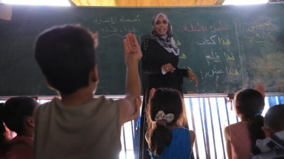 Il n’y a pas de cloche pour marquer le début et la fin des cours, pas de chaises ni de bureaux. Les élèves, qui cherchent désespérément à retrouver une routine d’avant la guerre, utilisent tous les papiers qu’ils peuvent trouver et un crayon pour noter la leçon du jour. Aujourd’hui, il s’agit de grammaire arabe et d’utilisation de « ceci » et de « cela ».