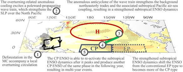 Le Dr Ting-Hui Lee, de l’Université de Californie, et ses collègues ont utilisé le modèle du système terrestre communautaire pour simuler une hypothétique déforestation future sur 100 ans, en changeant les arbres à feuilles persistantes et à feuilles caduques indigènes en herbe C4. Il a été constaté qu’une telle activité renforçait ENSO, entraînant une fréquence accrue des événements et un déplacement vers le Pacifique central. Cela se produit via le mécanisme d’empreinte saisonnière, par lequel les températures de surface de la mer aux latitudes moyennes en hiver affectent l’atmosphère subtropicale au printemps et en été suivants.
