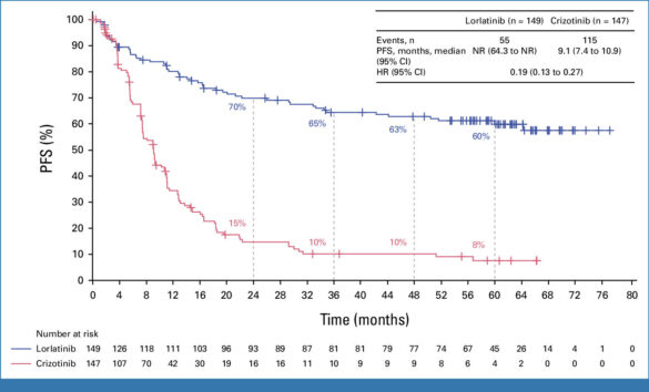 Benjamin J. Solomon et al, Lorlatinib versus Crizotinib chez les patients atteints d'un cancer du poumon non à petites cellules ALK-positif avancé : résultats sur 5 ans de l'étude CROWN de phase III, Journal d'oncologie clinique (2024). DOI : 10.1200/JCO.24.00581