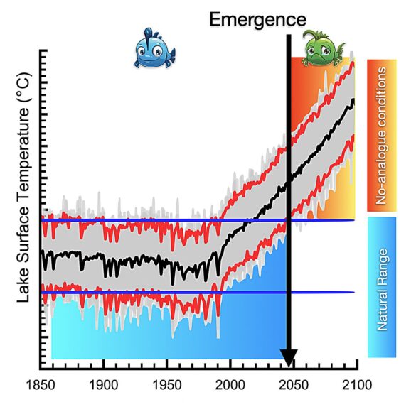 Grâce à cette approche de modélisation d’ensemble, les scientifiques ont pu distinguer les variations naturelles de température des lacs de celles causées par l’intervention humaine. Cela a permis à l’équipe d’estimer pour la première fois le moment où les températures des lacs dépasseront définitivement les limites naturelles, une situation appelée conditions sans analogue.
