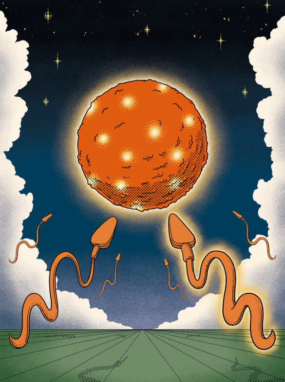 L’œuvre d’art présente une représentation allégorique d’un événement de fécondation au cours duquel un gros spermatozoïde (en jaune – la couleur symbolisant la graisse) conquiert l’ovocyte (la lune dans un ciel plein d’étoiles) et l’éclaire en transférant des informations épigénétiques induites par l’alimentation. Crédit : Philipp Beck