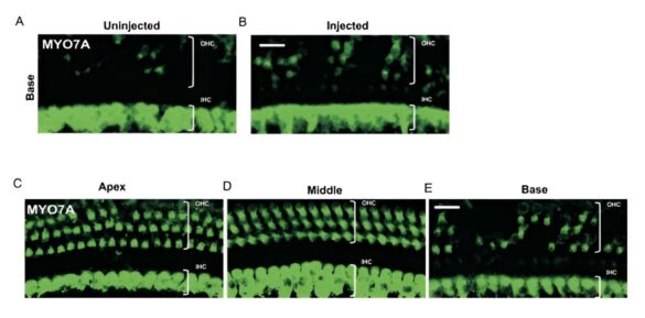 L’équipe a utilisé une approche d’édition du génome CRISPR/Cas9 pour cibler et perturber cette mutation, qui a été délivrée à l’oreille interne par l’injection d’un virus adéno-associé (AAV) porteur du mécanisme d’édition. Ils ont comparé les injections à deux moments précis, au cours du développement précoce et à l’âge adulte, et ont démontré une préservation robuste de la fonction auditive dans les deux cas à long terme, l’intervention précoce s’avérant la plus optimale.