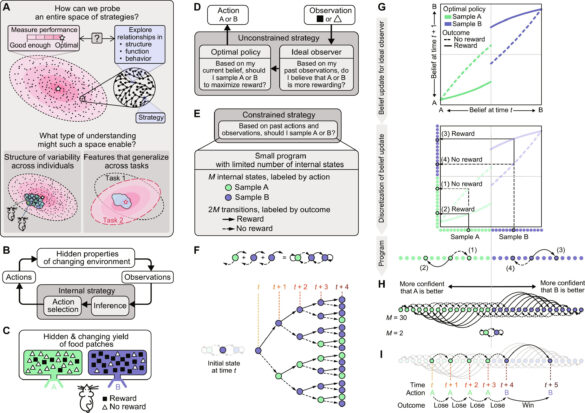 Construire des programmes comportementaux compacts. (A) En haut : L’espace des stratégies permettant de résoudre une tâche peut être vaste, avec de nombreuses stratégies permettant d’obtenir des performances suffisamment bonnes. En bas : L’étude des relations entre les stratégies pourrait fournir un aperçu de la variabilité comportementale des animaux et des tâches. (B) Configuration générale de la tâche : un animal fait des déductions sur les propriétés cachées de l’environnement pour guider ses actions. (C) Configuration de tâches spécifiques : un animal se nourrit à partir de deux ports dont les probabilités de récompense changent avec le temps. (D) La stratégie optimale sans contrainte consiste en une politique optimale couplée à un observateur idéal bayésien. (E) Nous formulons une stratégie contrainte sous la forme d’un petit programme qui utilise un nombre limité d’états internes pour sélectionner des actions basées sur des actions et des observations passées. (F) Chaque programme génère des séquences d’actions en fonction des résultats des actions passées. (G) La stratégie optimale sans contrainte (D) peut être traduite en un petit programme en discrétisant la mise à jour des croyances mise en œuvre par l’observateur bayésien idéal et couplée à la politique comportementale optimale. En haut : mise à jour des croyances optimales. Milieu : les valeurs de croyance peuvent être divisées en états discrets (cercles pleins) étiquetés par l’action qu’elles spécifient (bleu contre vert). La mise à jour des croyances spécifie les transitions entre les états, selon qu’une récompense a été reçue ou non (flèches pleines ou pointillées). En bas : États et transitions représentés sous forme de programme bayésien. (H) En haut : un programme à 30 états se rapproche de la mise à jour bayésienne en (G) et comporte deux directions d’intégration qui peuvent être interprétées comme une confiance croissante dans l’une ou l’autre option. En bas : le programme bayésien à deux états, gagner-rester, perdre-aller (WSLG), continue d’effectuer la même action en cas de victoire (c’est-à-dire recevoir une récompense) et change d’action en cas de perte (c’est-à-dire ne pas recevoir de récompense). (I) Exemple de comportement produit par le programme bayésien à 30 états en (H). Crédit: Avancées scientifiques (2024). DOI : 10.1126/sciadv.adj4064